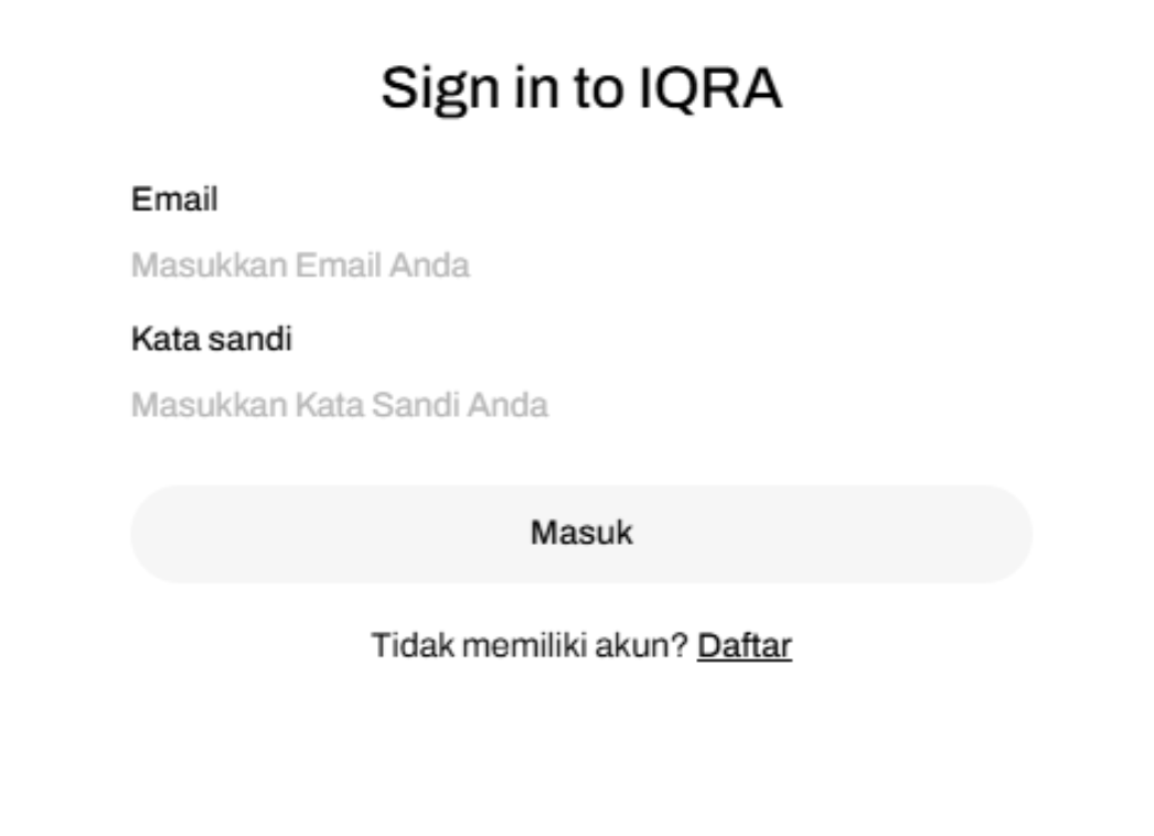 Untuk memastikan keamanan dan akses yang tepat ke IQRA ChatBot LLM, pengguna harus melalui proses login yang memerlukan informasi sebagai berikut: